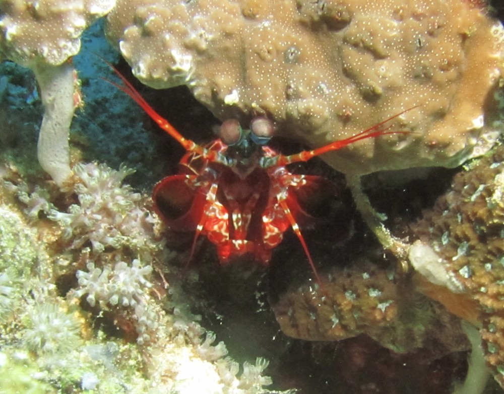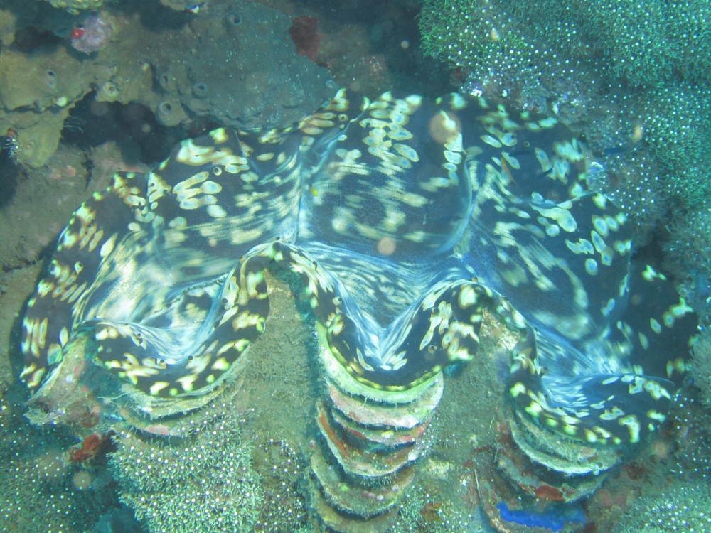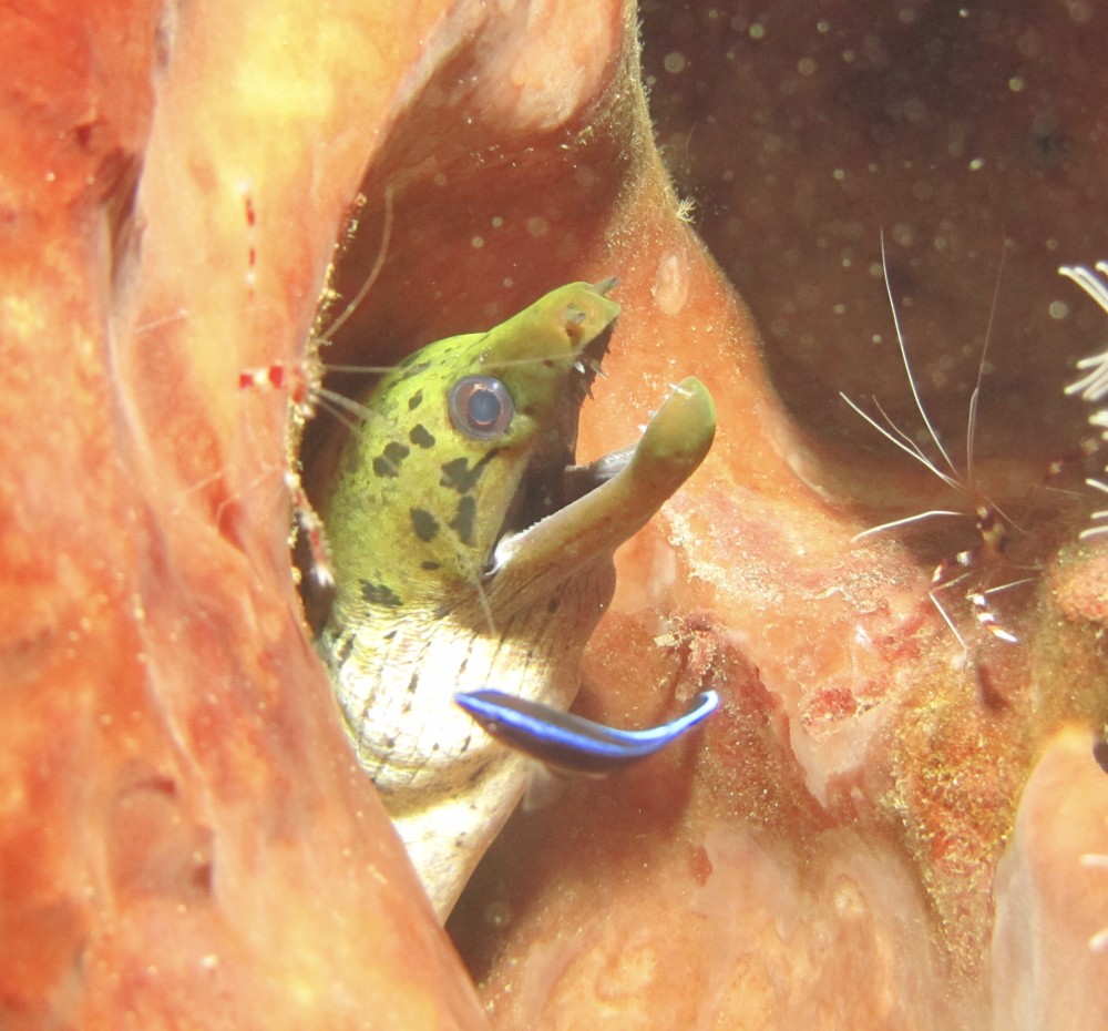 Giant clam Eel getting cleaned by cleaner wrass in big barrel sponge Blue ribbon eel Mantis shrimp