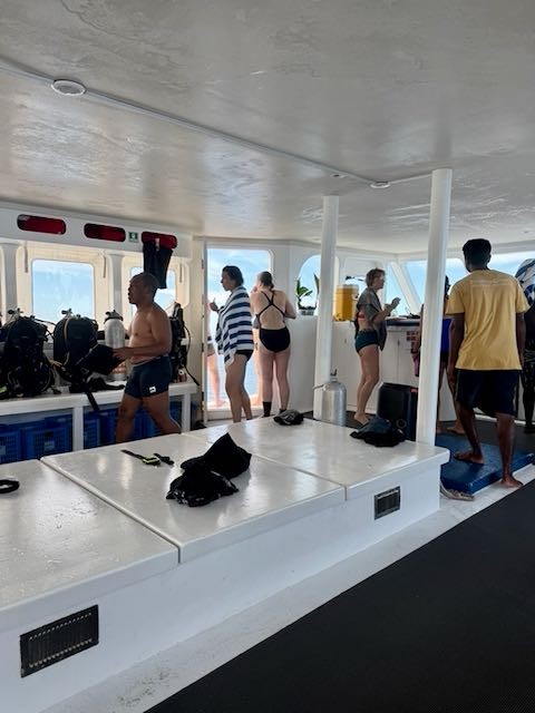 Island dinner Dive briefing Birthday buddies Divers aboard the Dhoni EcoPro Seascape and Dhoni